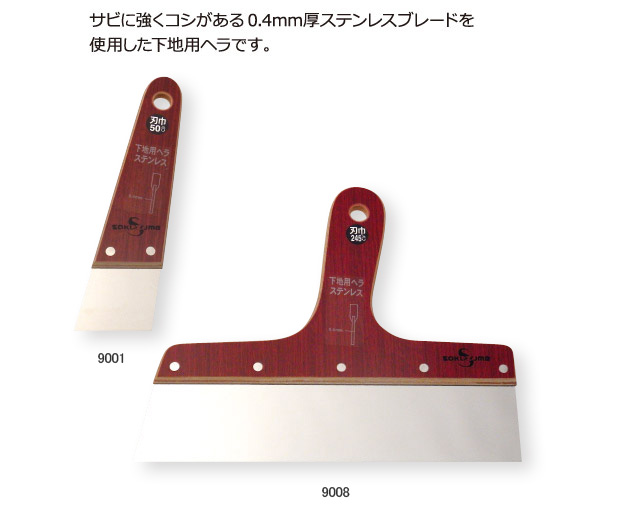 下地処理 ステンレス地ベラ ハガネ地ベラ フッ素加工パテベラ しなるパテベラ ゴールドパテベラ SS下地用ステンレスヘラ SS下地用ハガネヘラ SSフッ素加工パテベラ SSしなるパテベラ SSゴールドパテベラ 内装工具、DIY商品製造販売のご相談、お問い合わせは… TEL:0256-33-1429FAX:0256-32-0399 株式会社坂爪製作所 〒955-0044 新潟県三条市田島2丁目21番2号